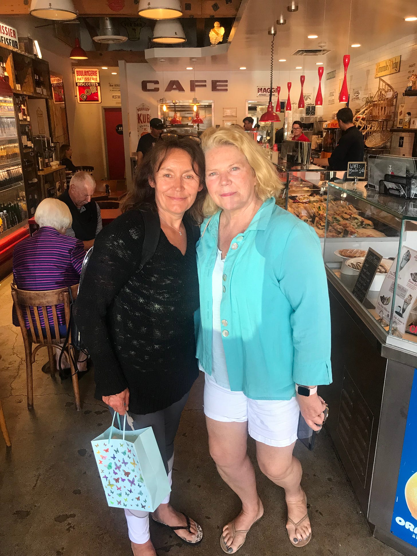 We don’t bother to hurry. Moulins in Laguna Beach is French-owned and more likely to be late in opening than any other breakfast place in the Southern California seaside town that wakes with the birds and the jaunty joggers dodging the homeless squatting on million-dollar views of the Pacific Ocean.